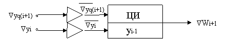 В связи с тем, что значение приращения Ñyq(i+1) в i-м шаге неизвестно, его либо экстраполируют, например по линейному закону: либо принимают равным Ñyqi. В тех случаях, когда Ñyqi =Ñt, цифровой интегратор воспроизводит численное интегрирование по Риману yi=Ñyi-1+Ñyi; ÑWi+1 =yiÑt. Очевидно, что при постоянном шаге Ñt экстраполяция приращений независимой переменной t не требуется. 8.Структура цифровых интеграторов Структура ЦИ, инвариантная относительно интегрирования по Риману или по Стилтьесу, может быть представлена в виде схемы, показанной на рисунке 6.
